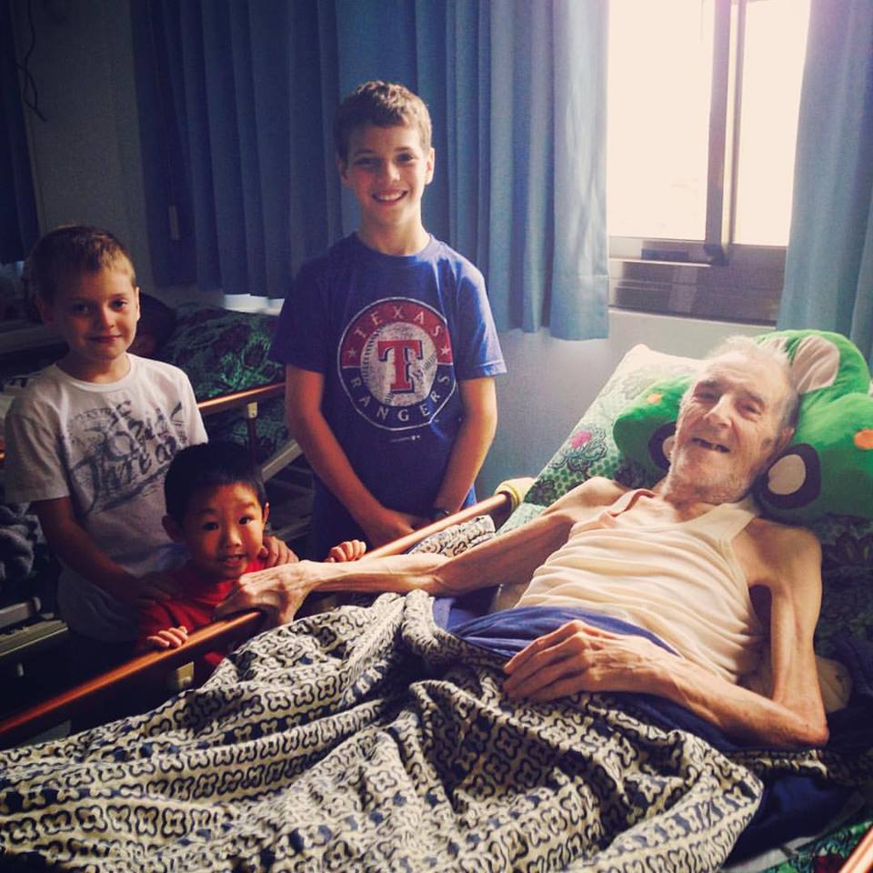 Mr. Thomaschek was born in New York in the 1920s and is a WWII vet. He entertained the boys with stories from the war years–the weeks spent crossing the Atlantic, the invasion of southern France that he was part of, the liberation of Paris, being injured by an artillery blast and spending months in the hospital before traveling home to New York on the Queen Elizabeth II. He’s led a fascinating life and loves to tell stories. Mr. Thomaschek never married, though he wanted to. He has no family left in the U.S. We are still trying to figure out if there are any tangible ways we can improve his situation. He doesn’t speak Chinese and no one at the hospice speaks English; I know he gets lonely and would appreciate cards and notes to send him a little cheer.”
