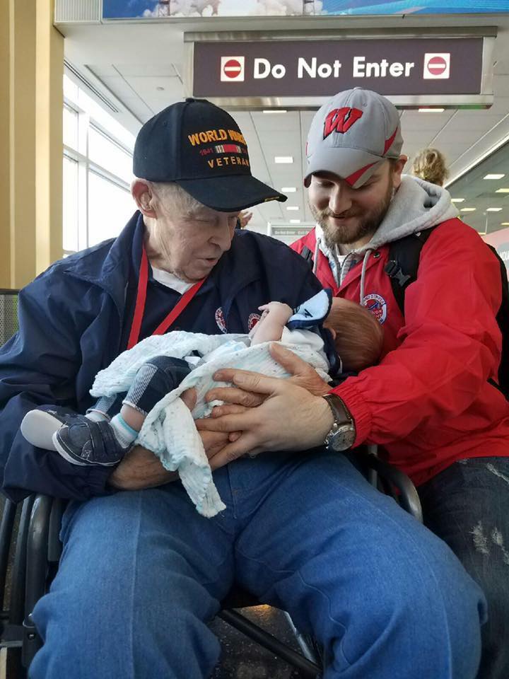 Introducing your OCTOBER 2016 PHOTO OF THE MONTH from the Stars and Stripes Honor Flight arrival on 10/15/16. This DC-based guardian (in red) was able to meet his Grandfather (in navy blue), a WWII Veteran, who traveled to DC for his Honor Flight! It was so moving to watch this guardian and his wife introduce their grandpa to his brand-new, one-month-old, great-grandson (the tiny one!) as he arrived in DC!