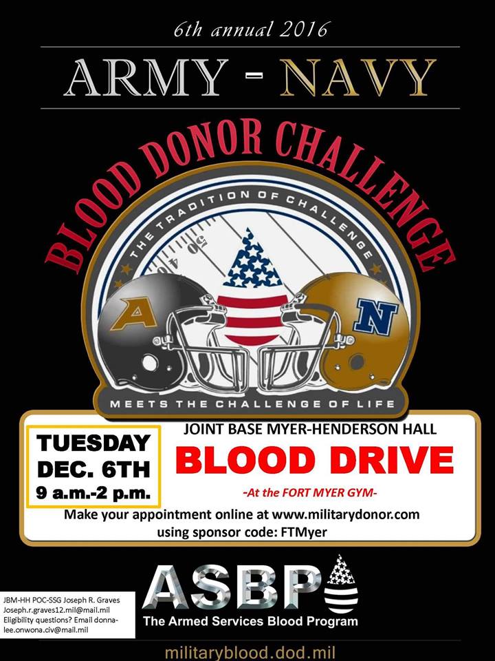 December 6 — come join us at Joint Base Myer-Henderson Hall for a blood drive at the Fort Myer Gym. Make your appointment online at www.militarydonor.com using sponsor code FTMyer. Hope to see you there!